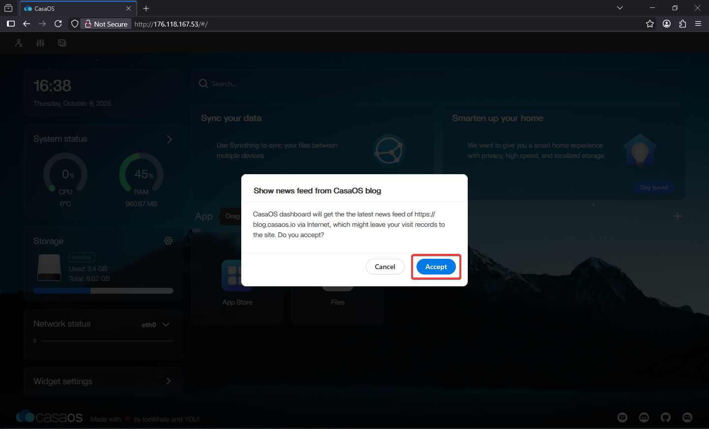 Upon successful user creation, the system will start and you can accept the platform update.