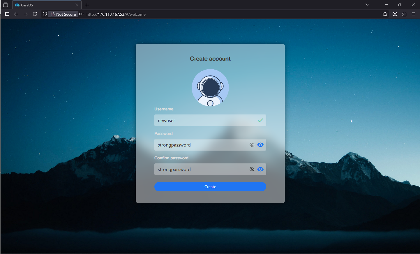 Enter a username and a complex password (twice) to register in the workspace and click the Create button.
