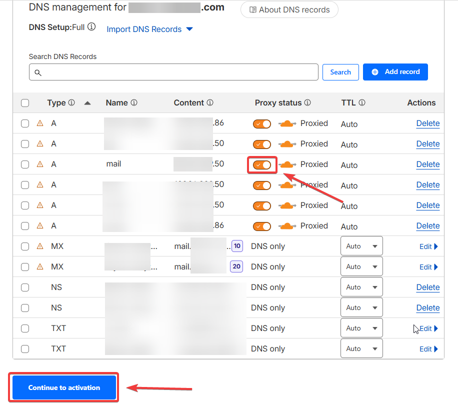Это хорошо для web, но совершенно не работает для почтовых доменов. А-запись для MX нужно направлять без проксирования. TXT записи (DKIM, DMARC, SPF) возможно потребуется вручную скопировав с DNS хостинга. Эти настройки поставляет сервер хостинга.