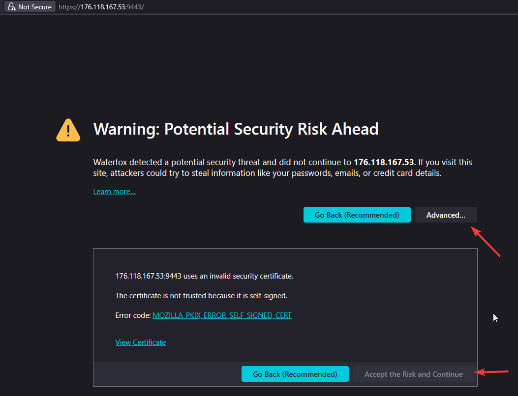 Это не является проблемой. Система работает по протоколу HTTPS, но переход выполняется по IP. Нажмите на странице "Дополнительно" и "Перейти небезопасно".